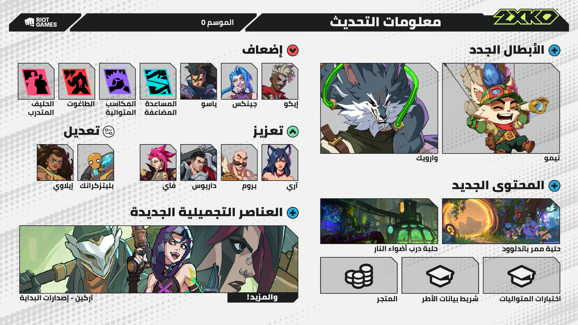 أهلًا بكم في الإصدار المبكر من 2XKO وفي الموسم 0 في اللعبة! عند بداية موسمٍ جديد، عادةً ما نُجري تحديثات مهمة في اللعبة، وسنشرح لكم تفاصيلها في مقالة معلومات تحديث كهذه.