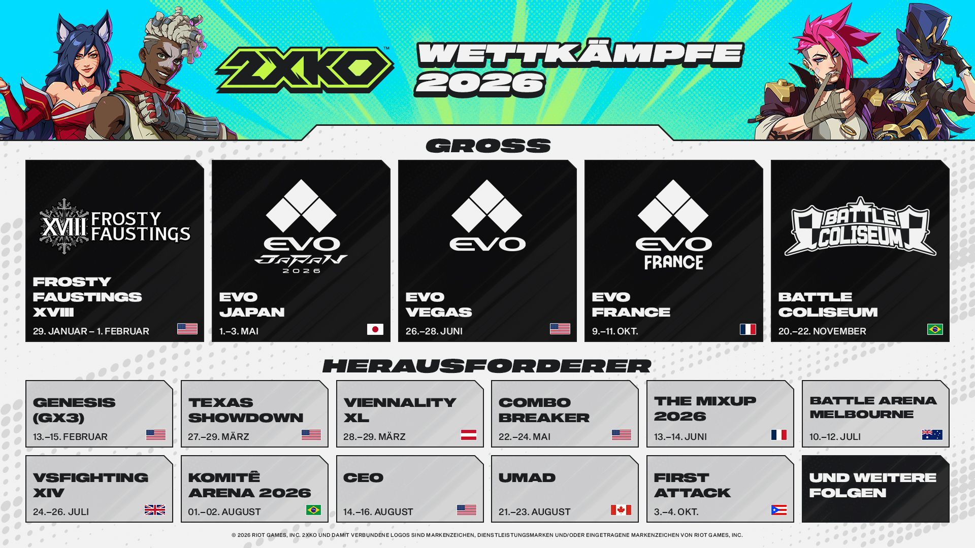 Hier ist der vollständige Wettkampfkalender für 2XKO im Jahr 2026.
