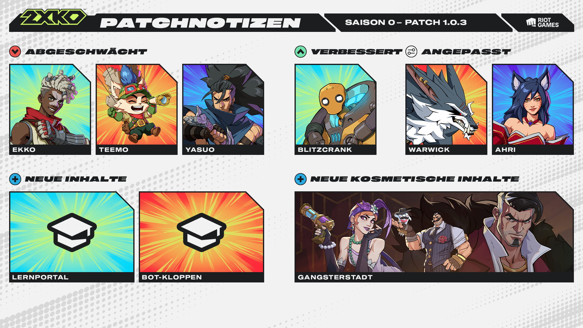 Hallo. Unser nächster Patch (1.0.3) erscheint am 18. November mit einigen Championanpassungen, einem neuen Lernportal und einer Reihe von Fehlerbehebungen.