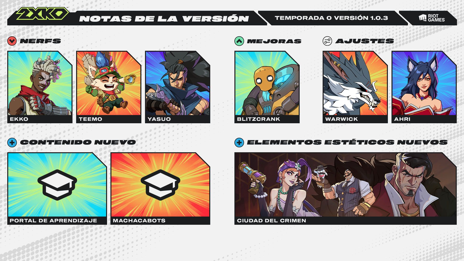 ¡Hola! La siguiente versión (la 1.0.3) estará disponible a partir del 18 de noviembre e incluirá un nuevo portal de aprendizaje, varios ajustes a campeones y un montón de correcciones de errores.