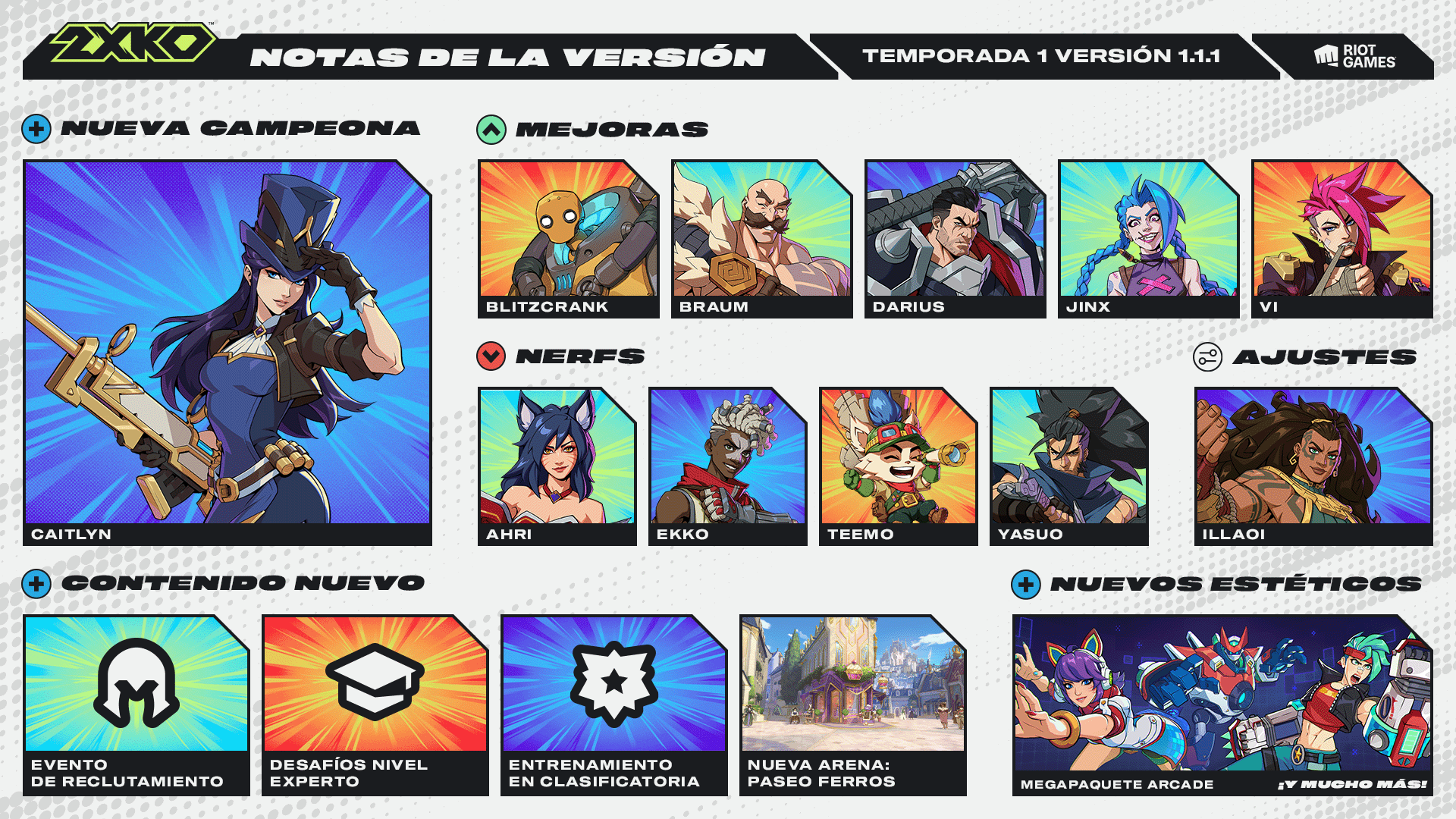 ¡Les damos la bienvenida al lanzamiento oficial de 2XKO! Nos complace anunciar que el juego ahora estará disponible en consolas. Además, daremos comienzo a la temporada competitiva de 2026. Sin más preámbulos, veamos qué nos tiene preparado la versión 1.1.1.