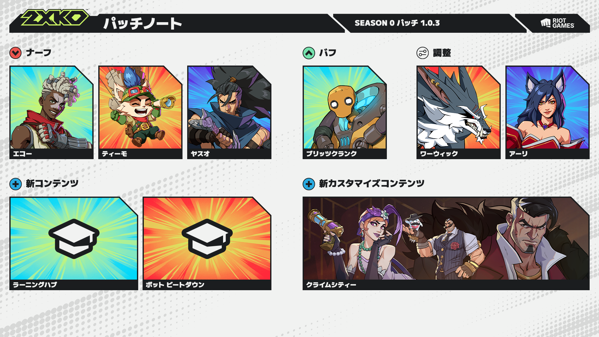 チャンピオン調整の確認をする前に、ぜひ本日公開された2XKO:ライブバランスの方針の記事をご覧ください。この記事では、ライブバランス担当プロデューサー、Patrick “pattheflip” Miller が、チームがどのような方針でライブバランスに取り組んでいるかをより詳しく解説しています。