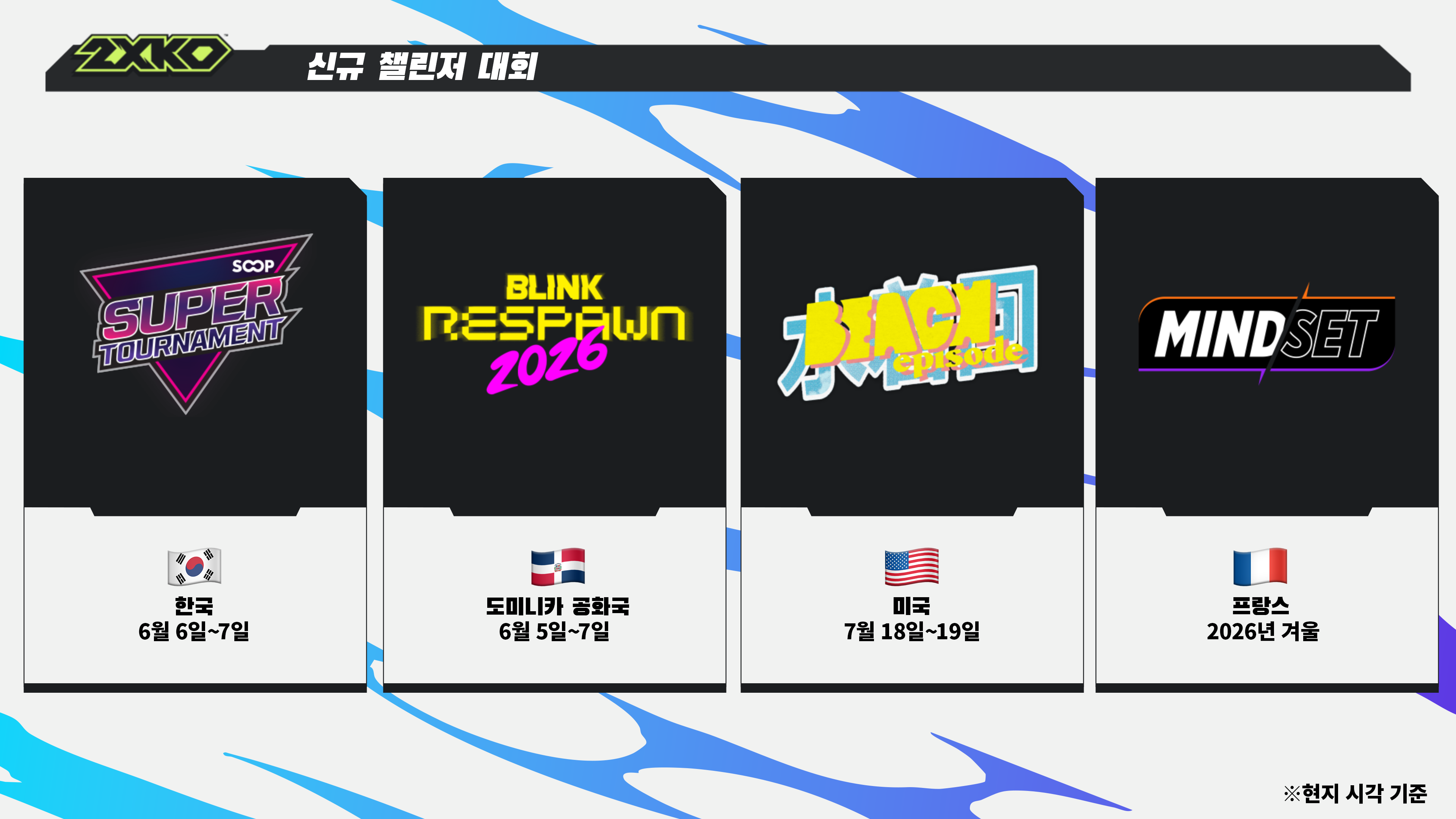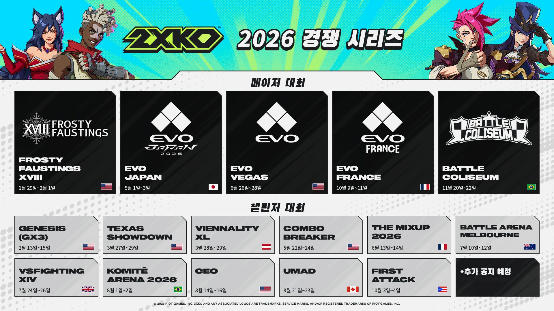다음은 2XKO의 2026년 전체 대회 일정입니다.