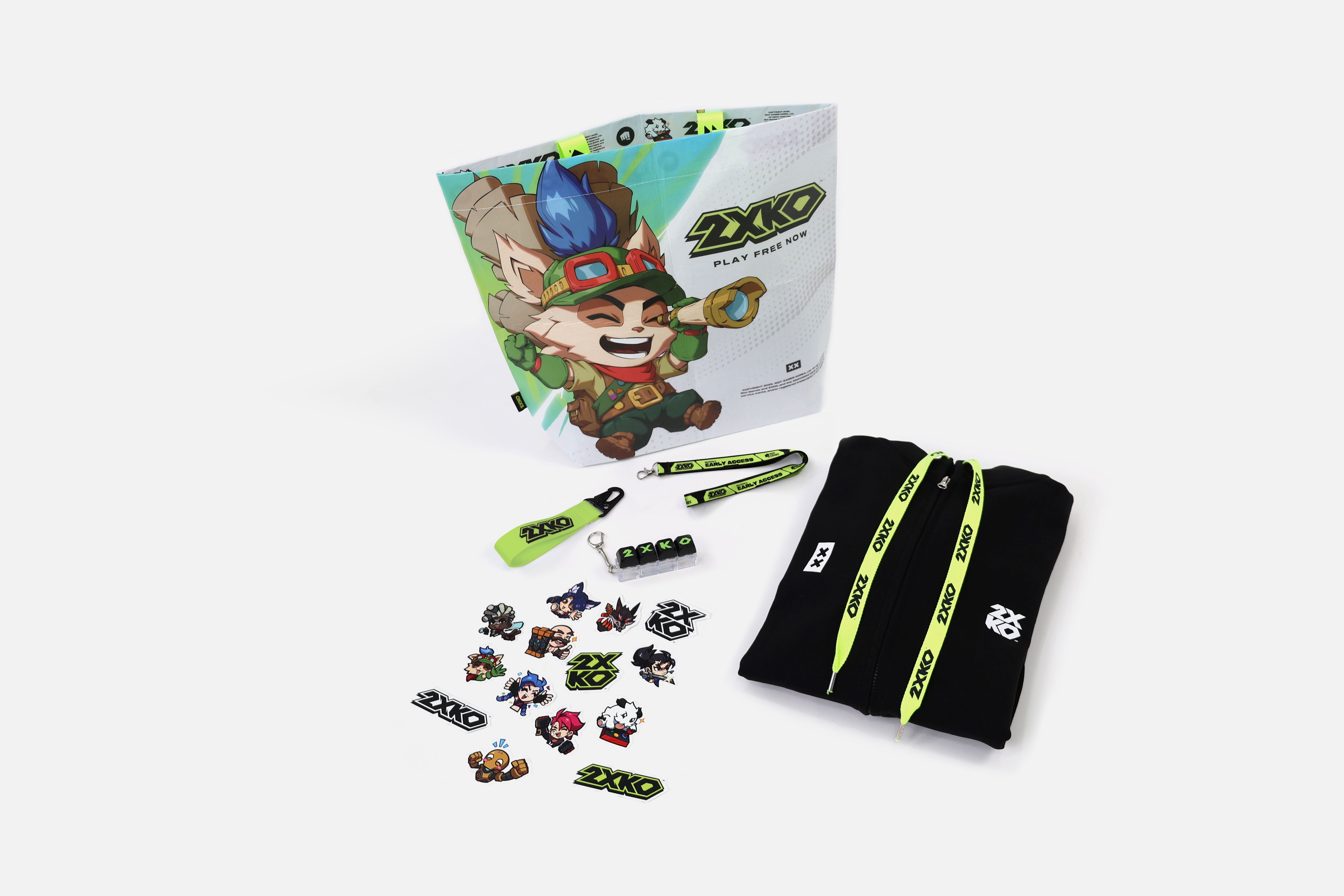 구성품: 2XKO 후드 집업, 리유저블 백, 키캡 키링 & 스트랩 키링, 2XKO 스티커 세트, 랜야드