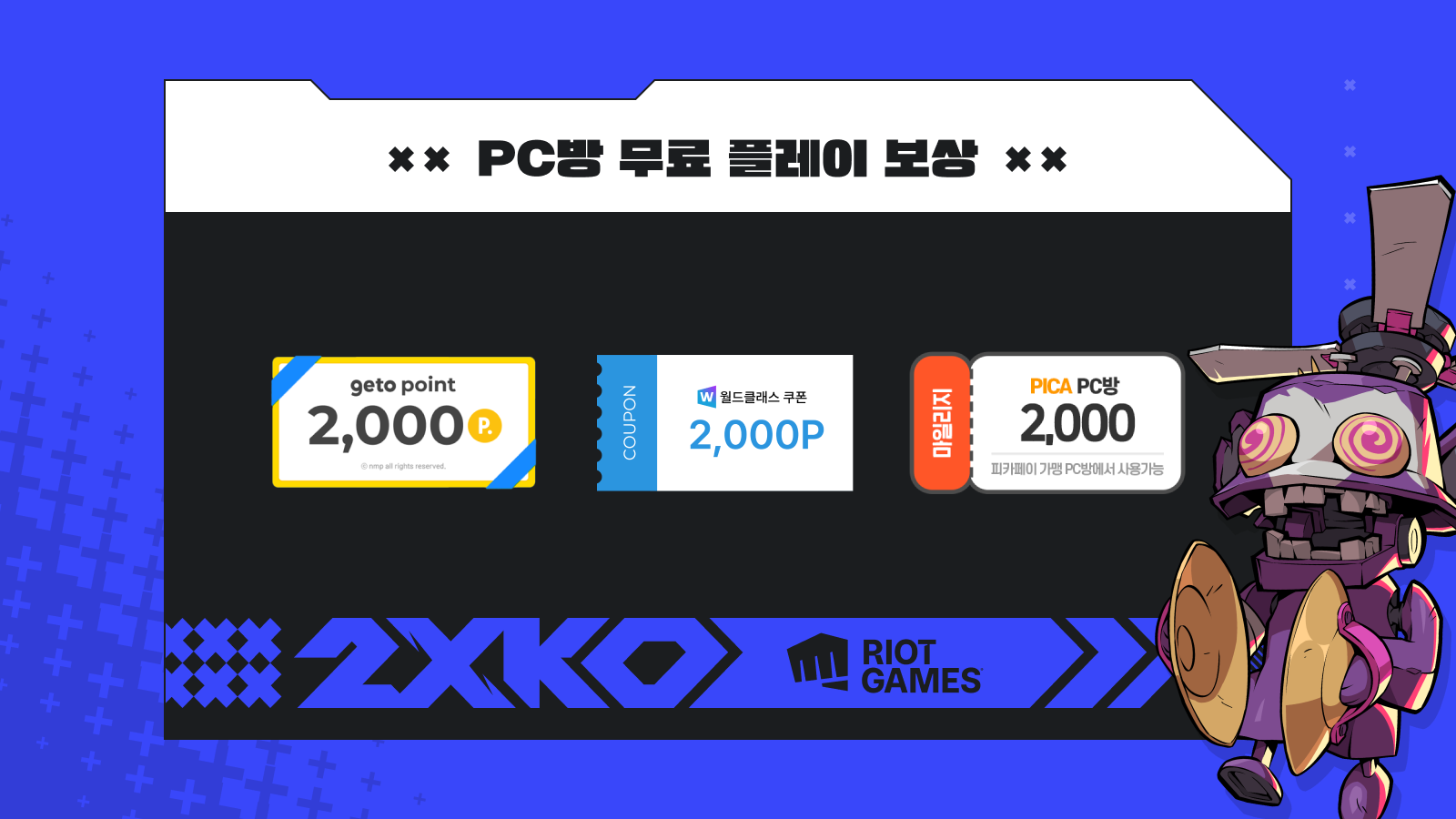 PC방 무료 플레이 보상 미션은 라이엇 PC방 가맹점에서만 참여 가능하며, 라이엇 PC방 가맹점이 아닌 PC방에서 2XKO를 플레이하면 참여가 제한될 수 있습니다.