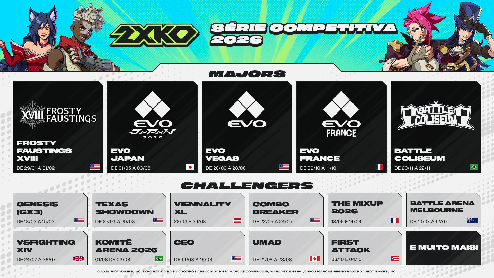 Em 2026, a Série Competitiva do 2XKO inclui 15 eventos Challenger e 5 eventos Major. Tudo pronto para lutar entre os melhores do 2XKO? Continue lendo para mais informações sobre os planos do competitivo, incluindo como se inscrever.
