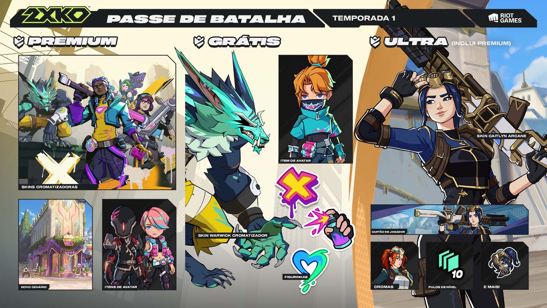 Inclui 3 skins de Arcane, todos os cromas de skin de Arcane, um conjunto de figurinhas de Arcane e mais KO Points, além de tudo que está incluso nos pacotes Padrão e Deluxe.